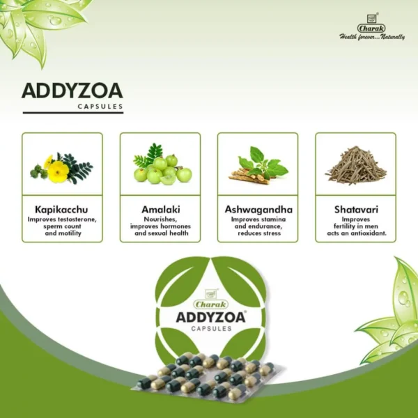 Charak Addyzoa Capsule is a specialized herbal formulation designed to support male reproductive health and optimize fertility. Powered by a unique blend of time-tested Ayurvedic ingredients, Addyzoa works by protecting sperm from oxidative stress, improving sperm count, enhancing motility, and boosting overall sperm quality.
